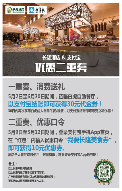来长隆酒店消费,不用带钱包,只要有支付宝,享受无需等待的秒付体验!即日起,到餐厅消费还能享受支付宝专属优惠哦!