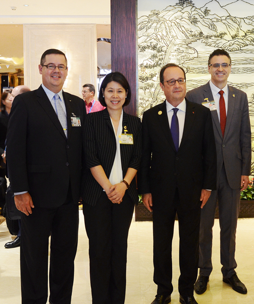 2016年9月4日,雅高酒店集团大中华区区域餐饮总监/山东区域营运总监柯瑞文(左一)、杭州索菲特西湖大酒店总经理范斯先生(右一)和酒店业主代表/副总经理竺丽萍女士(左二)于酒店大堂欢迎法国总统弗朗索瓦•奥朗德。